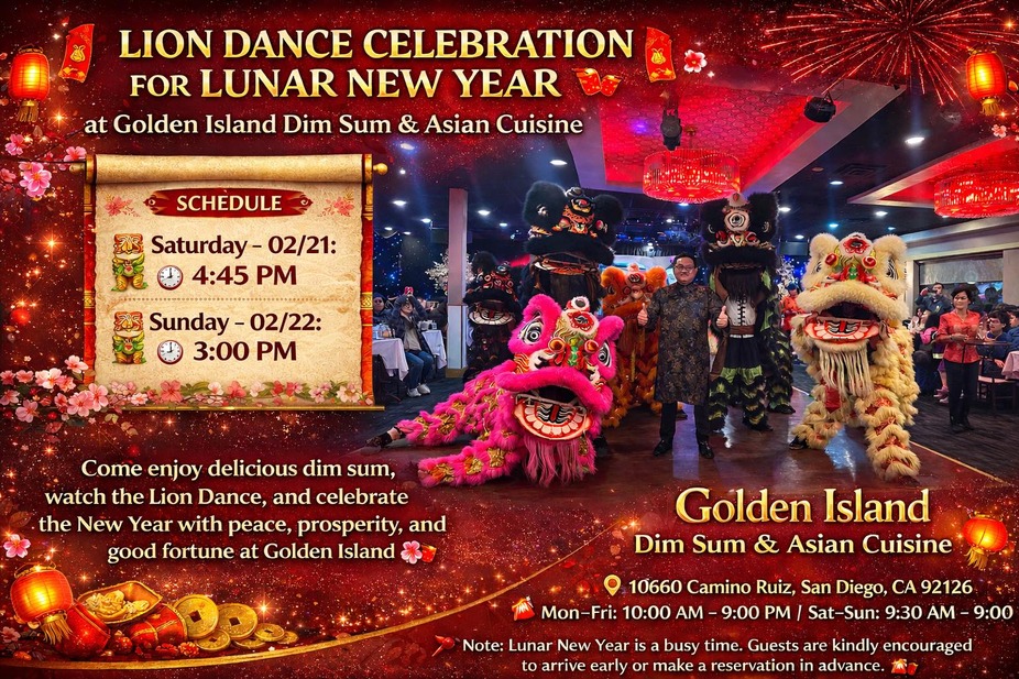 LION DANCE CELEBRATION FOR LUNAR NEW YEAR at Golden Island Dim Sum & Asian Cuisine As Lunar New Year arrives, Golden Island cordially invites our valued guests to dine with us and enjoy a live traditional Lion Dance performance to welcome the Spring season right at our restaurant Lion Dance Schedule: Sunday – 02/22: 3:00 PM Festive and lively Lunar New Year atmosphere Lion Dance & drum performance symbolizing good luck – prosperity – success Perfect for families and friends celebrating the New Year together Come enjoy delicious dim sum, watch the Lion Dance, and celebrate the New Year with peace, prosperity, and good fortune at Golden Island Note: Lunar New Year is a busy time. Guests are kindly encouraged to arrive early or make a reservation in advance for the best dining experience.