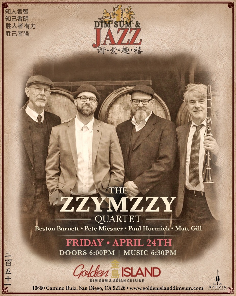 Friday, April 24, 2026 6:30 PM 8:30 PM Golden Island Dim Sum & Asian Cuisine (map)The guys from the Zzymzzy Quartet have simple ambitions: they just want to play it like it was when it was unamplified, melodic, swinging, dreamy, full of sly surprise. From the Prohibition through the Second Big War, the glory days of Louis Armstrong and Duke Ellington are being recaptured humbly and with humor in San Diego by four musicians who know it don’t mean a thing without that swing!
