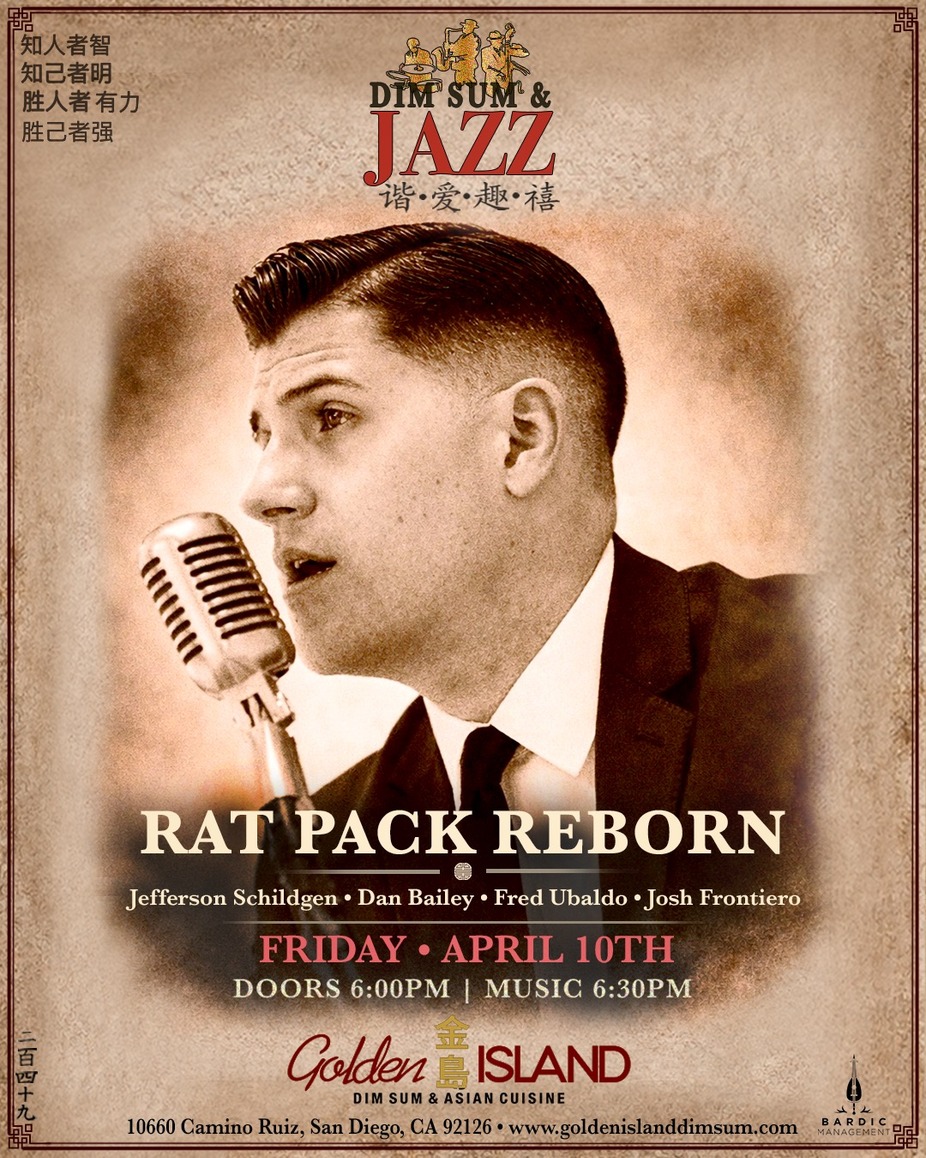 Friday, April 10, 2026 6:30 PM 8:30 PM Golden Island Dim Sum (map)Lead by Jefferson Shildgen, Rat Pack Reborn is a rat-pack style band that performs the hits of the 1940’s and 60’s in the classing swinger era styles that include Frank Sinatra, Dean Martin, and more!