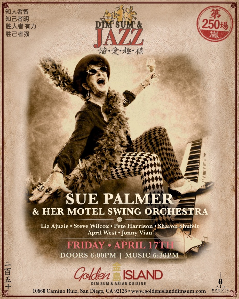 Friday, April 17, 2026 6:30 PM 8:30 PM Golden Island Dim Sum (map)Known world wide as The Queen of Boogie Woogie, The Sultana of Swing, and The Lady Who Skates on the 88s, Sue Palmer has been a presence on the live music scene in San Diego and the world for over 30 years.